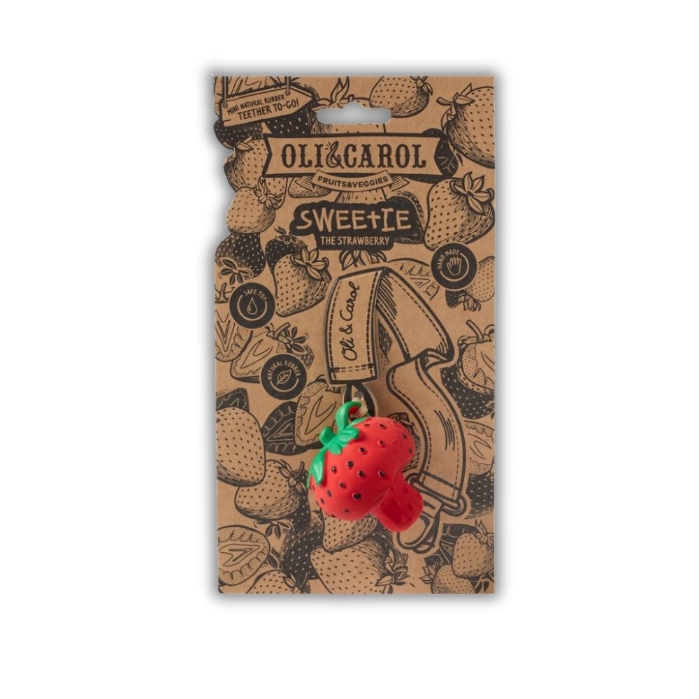 Căpșuna Sweetie este o jucărie naturală, sigură și plină de farmec - ideală pentru calmarea gingiilor, stimularea simțurilor și joaca bebelușilor, semnată Oli&Carol.