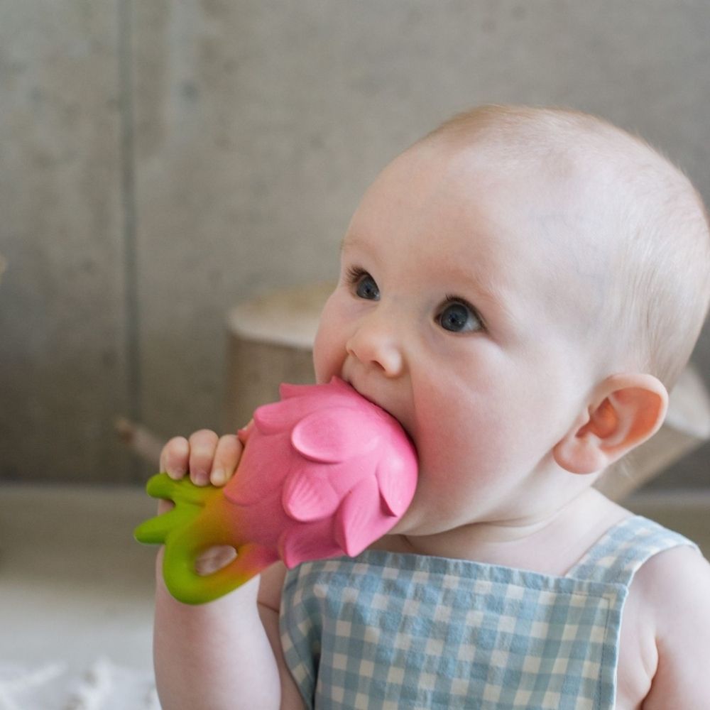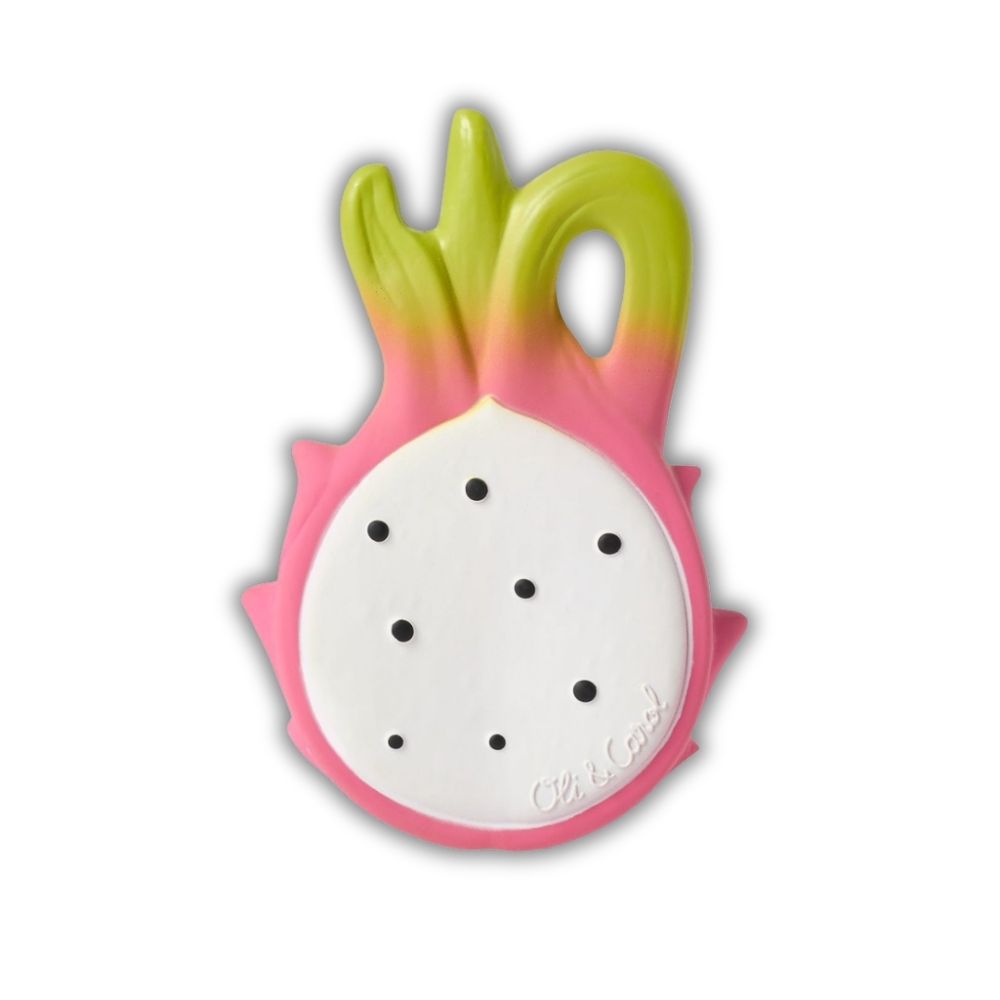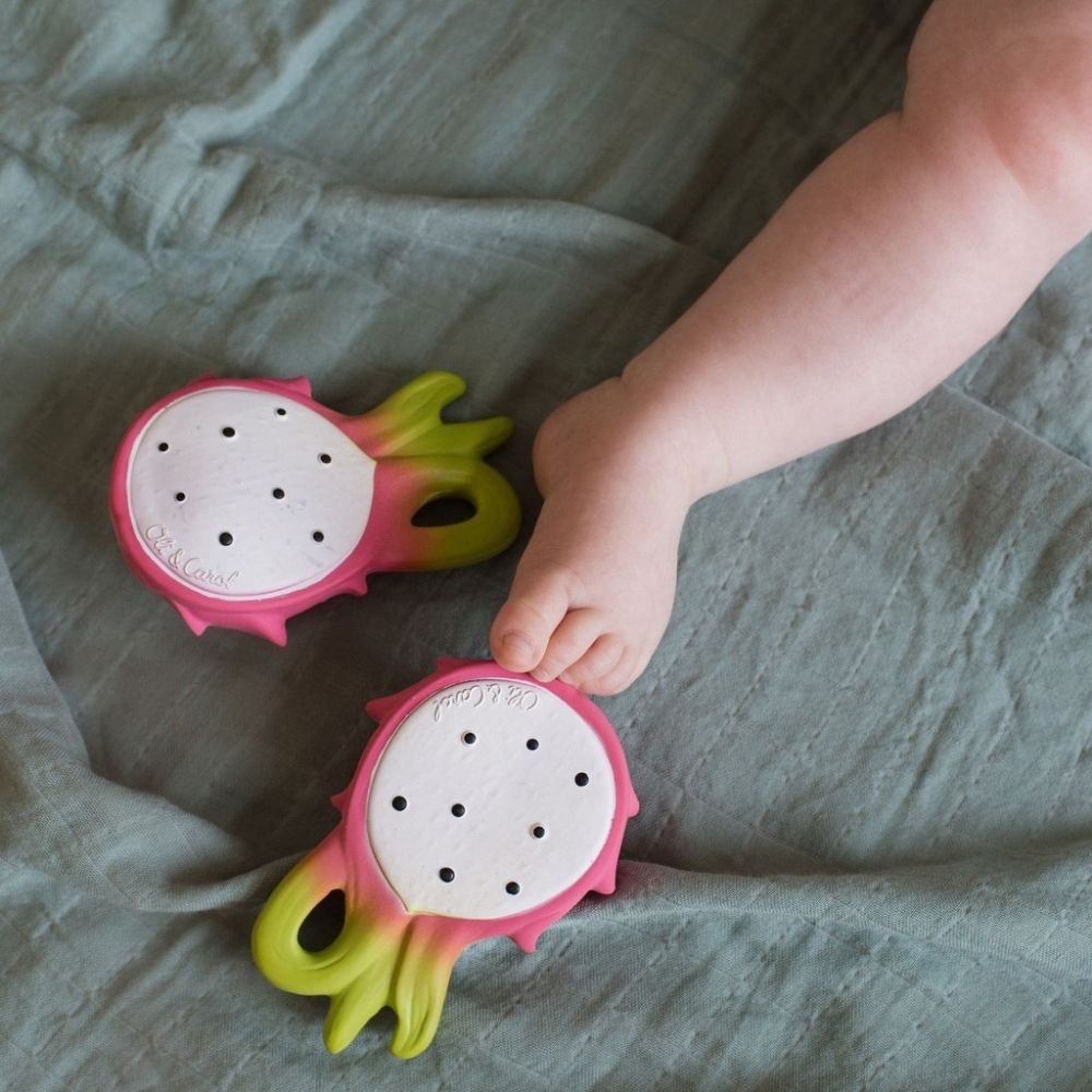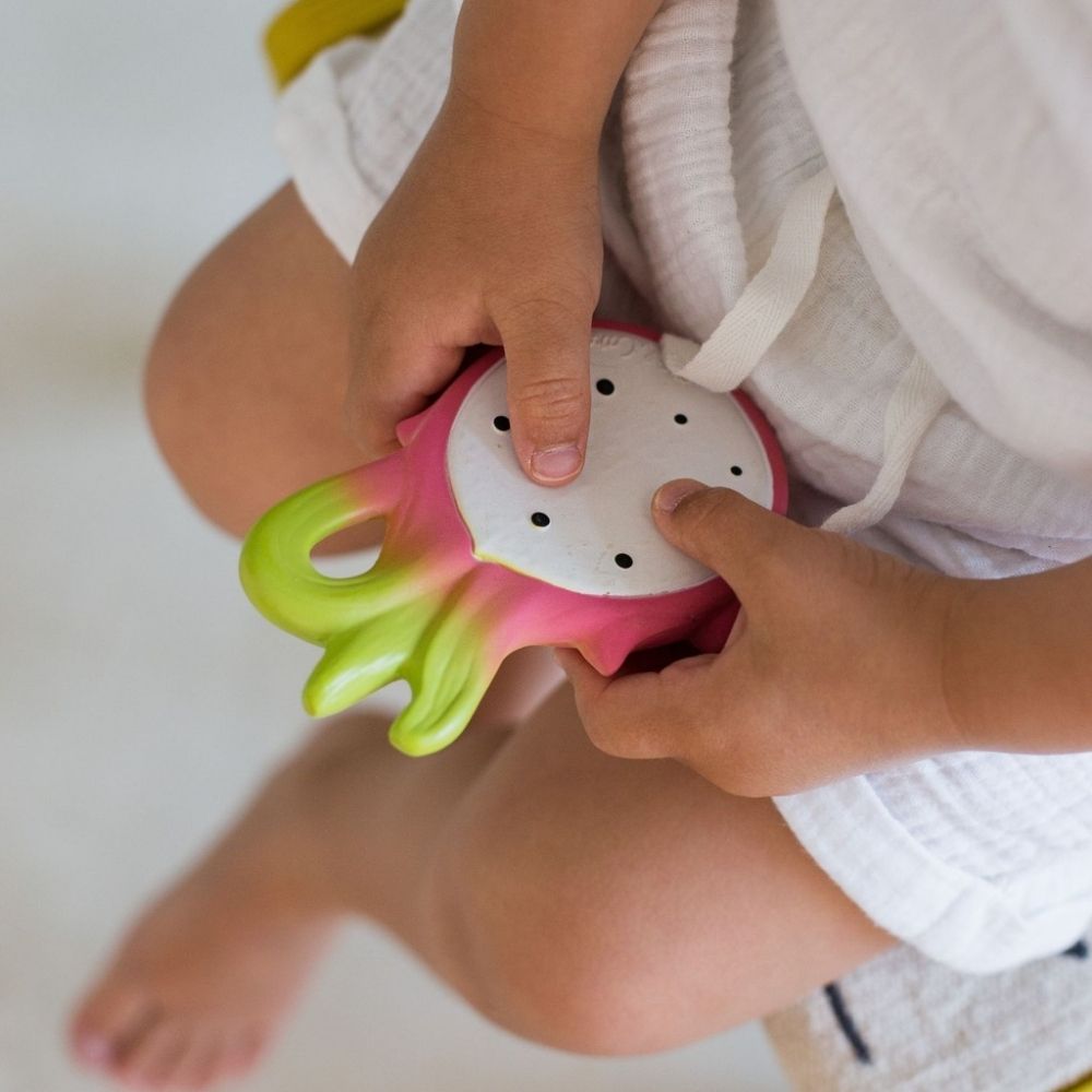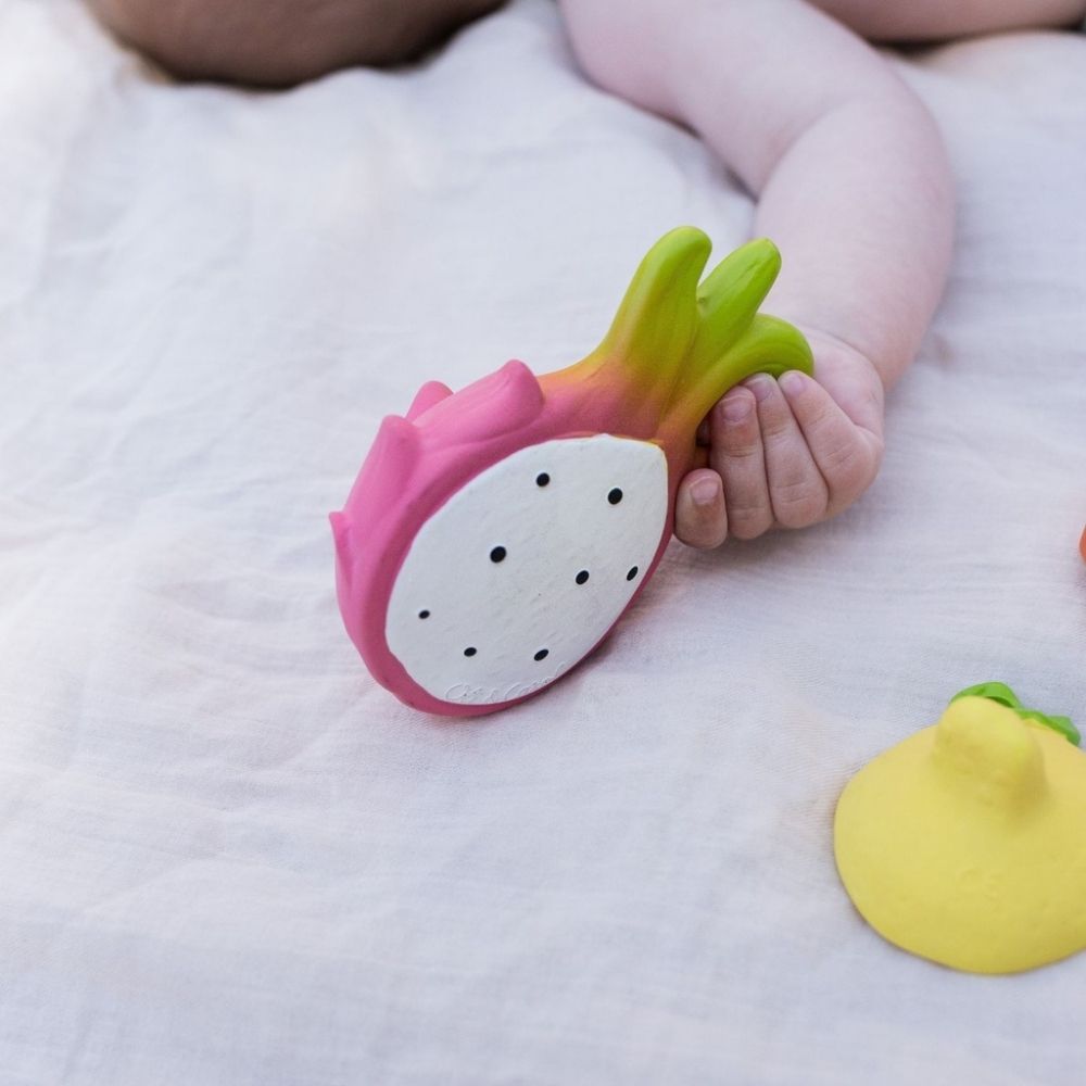 Fructul Dragon Fucsia este o jucărie naturală, sigură și veselă – ideală pentru calmarea gingiilor, joaca senzorială și băi pline de culoare, semnată Oli&Carol.