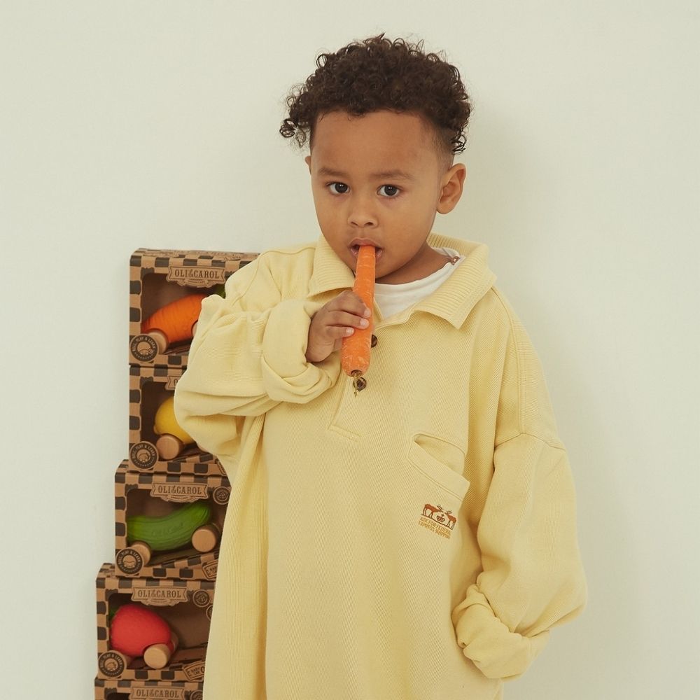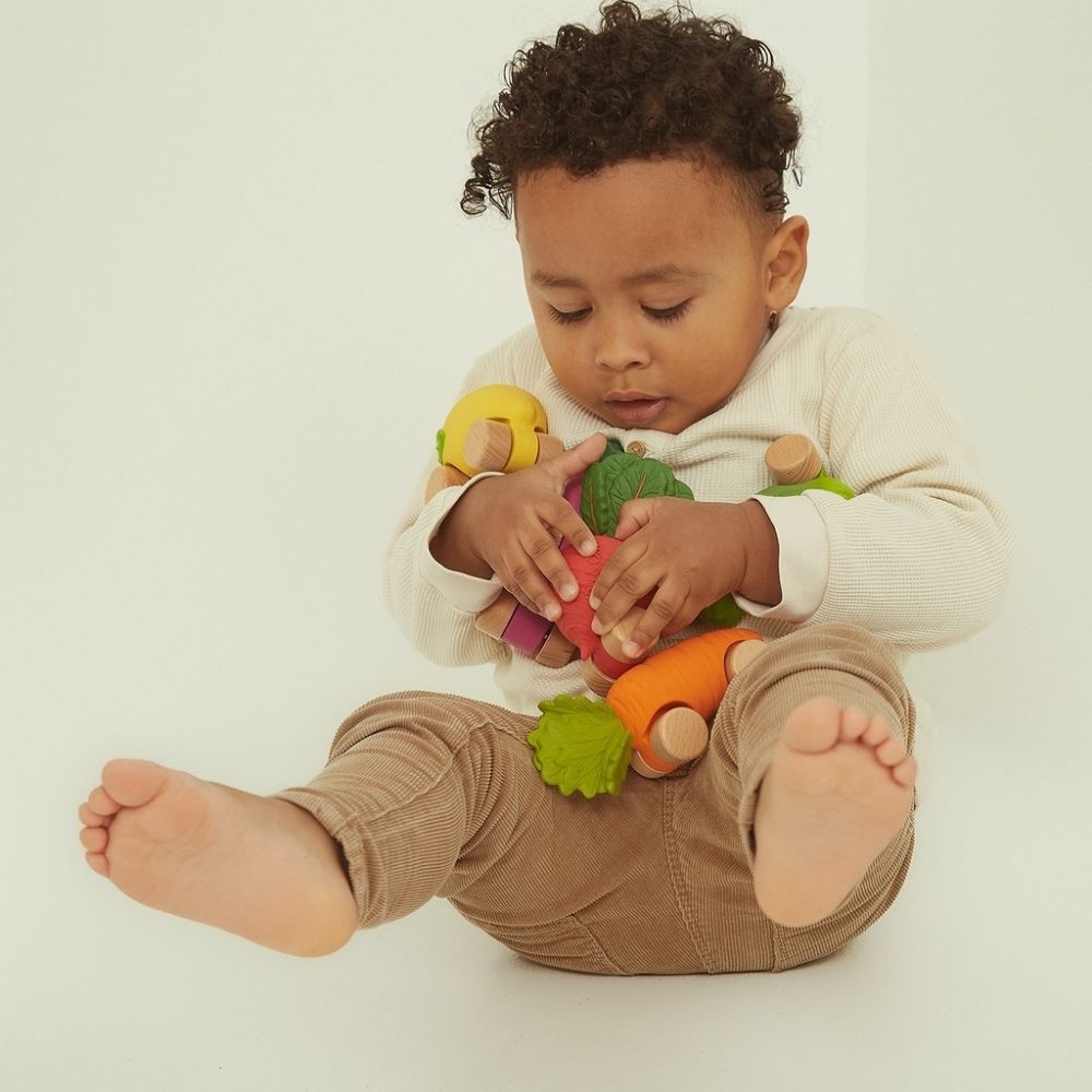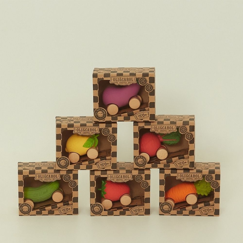 Mașinuța pentru bebeluși Morcovul Cathy de la Oli&Carol aduce joaca sustenabilă mai aproape de cei mici. Cu un design adorabil în formă de morcov, această jucărie îmbină distracția, siguranța și conștientizarea unui stil de viață sănătos. Realizată manual din cauciuc natural și lemn certificat FSC, Cathy este sigură pentru bebeluși, complet lipsită de plastic sau silicon. Roțile din lemn o fac ușor de rostogolit, iar textura moale și formele rotunjite stimulează coordonarea, motricitatea fină și imaginația. O jucărie perfectă pentru primele aventuri ale celor mici, potrivită încă de la naștere.